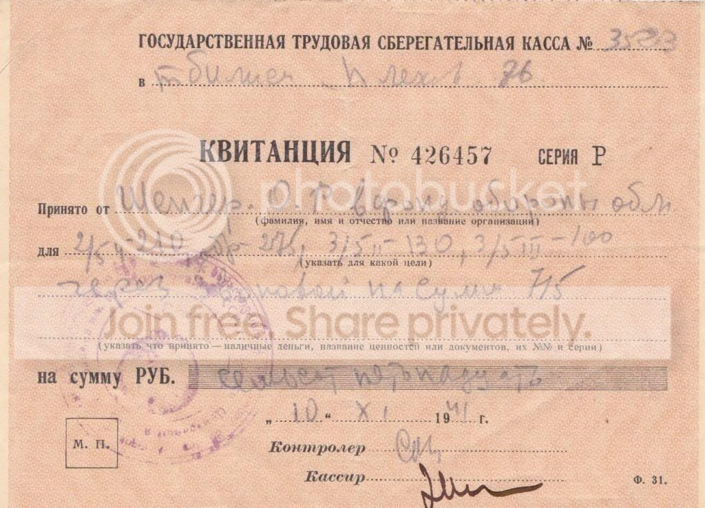 Квитанция из сберкассы о сдаче средств в фонд обороны. Ежели нечитаемо, могу разъяснить. Ну и предысторию, разумеется.